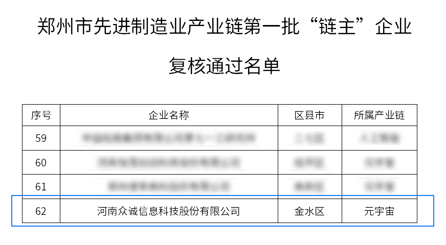 作为第一批郑州市先进制造业产业链-元宇宙产业链“链主”企业,3308维多利亚优惠大厅充分发挥链主企业“以大带小”“以点带链”的产业链“链主”责任感和影响力,聚焦元宇宙技术核心,助力打造向上生态,成功通过第一批“链主”企业复核。